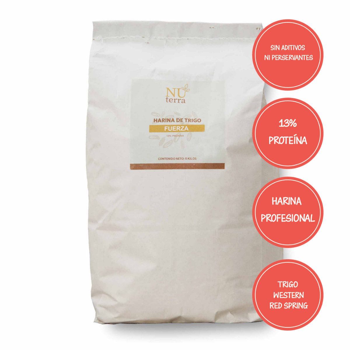 Harina de trigo Fuerza Especial de 5 kilos, los niveles de gluten de esta harina son los más altos de harinas de trigo del mercado. Esta harina es fabricada a partir de la molienda de trigo Red Spring Canadiense, el cual por naturaleza es muy alto en proteína. No contiene aditivos panaderos esto permite la creación de masas equilibradas de fácil manipulación. Ideal para preparaciones de panadería sobre todo para panes artesanales de masa madre requieran alta absorción y largas fermentaciones para obtener un pan de gran volumen con grandes alveolos, miga elástica y sabor intenso. También es recomendada para pizzas artesanales. Su equivalencia es harina "00".